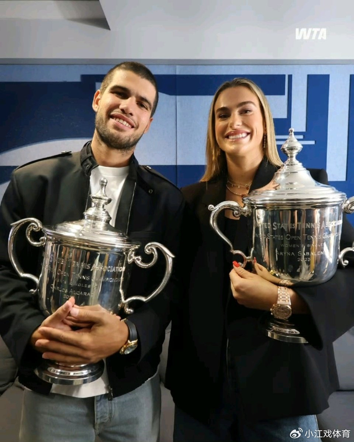 美网落幕,阿卡和萨巴伦卡双双捧起奖杯,一起跳舞、合影留念。有意思的是,炒皇的生日是1998年5月5日,阿卡的生日是2003年5月5日。所以,萨巴发文道:“同月同日生的两人和美网的两个单打奖杯。”