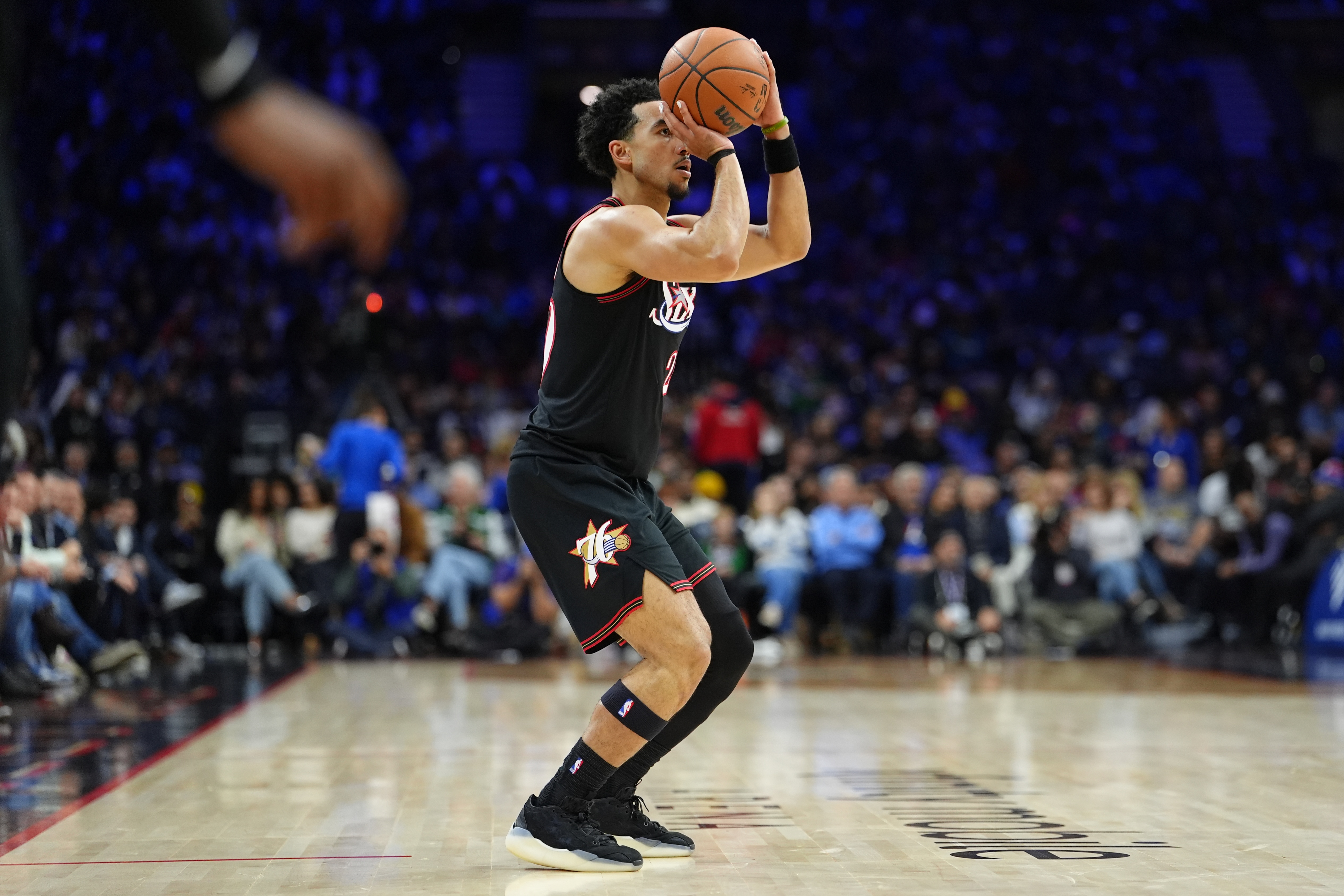 76人球员麦凯恩替补出战手感还挺不错,外线三分也很准。